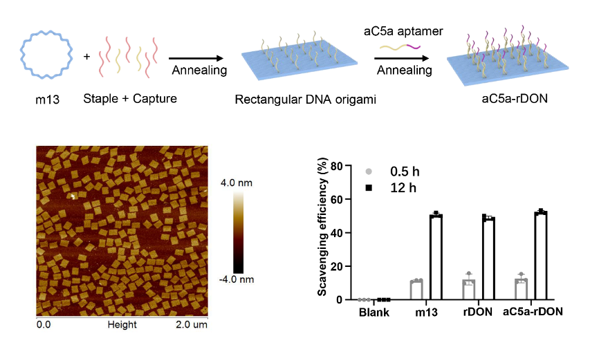AKI早期往往出现氧化应激障碍,线粒体损伤导致ROS产生过多,损伤细胞内正常蛋白或脂肪结构,进而导致后期细胞因子风暴的出现,严重影响肾脏功能的维持。然而,已有针对AKI的治疗往往集中在某个特定阶段,一旦疾病进展改变则导致治疗无效。针对以上问题,该研究工作在框架核酸上定点连接16个抗C5a补体系统适配体,构筑成DNA纳米机器。该纳米机器首先利用DNA本身的抗氧化能力消除大部分的ROS,缓解体内氧化应激障碍;后期抗补体系统适配体释放,进一步阻止细胞因子风暴的爆发。这种两步序贯治疗方法可多角度,多方位阻止AKI对肾脏的损伤破坏,达到整体缓解AKI目的,为临床AKI治疗(包括新冠伴发AKI)提供新方法,也为DNA纳米机器在疾病诊疗方面开拓了新的应用领域。