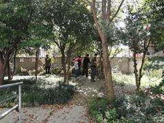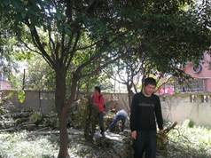 接下来同学们帮助养老院清理后院的树枝。由于养老院新修剪了后院的树木,大量的树枝被堆积在后院的角落,挡住了老人们散步的小道。同学们将树枝运到了养老院外的垃圾回收处。经过二十多分钟的努力,原本杂乱堆积的后院角落已被大家收拾得整齐干净。