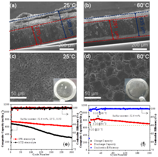 近期,该团队在本征安全锂硫电池研究方面获得了新的突破。采用双氟磺酰亚胺锂(LiFSI)溶于磷酸三乙酯(TEP)和高闪点氟代醚1,1,2,2-四氟乙基-2,2,3,3-四氟丙基醚(体积比1:3)获得了饱和电解液,其中锂盐浓度:1.1mol/L。相比于高盐浓度体系,该电解液体系具有低成本、低黏度等优点,而且进一步增强了高盐浓度体系对锂负极的保护。该本征阻燃电解液(IFR)具有优异的锂金属沉积溶出效率(高于99%),获得无枝晶的锂沉积形貌,即有效地消除了金属锂负极可能存在的安全隐患。在常温下锂对称电池(0.5mA cm-2/1.0mAh cm-2)寿命超过2400小时(100天)。在高温(60°C)测试条件下获得了微米级而且致密的锂沉积形貌。与高硫含量(52.6 wt%)的S@pPAN正极匹配时,60°C下正极材料比容量(840.1 mAh g-1,基于整个复合材料计算)和高的硫利用率(95.6%)。该体系的优点在于60°C高温条件下,实现了安全特性和电化学性能协同提升效应。