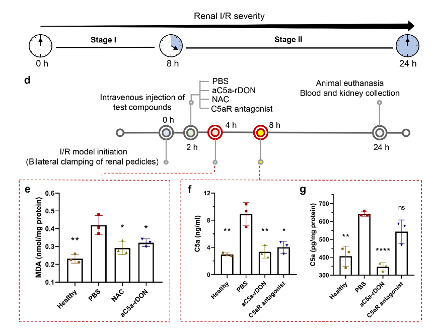 AKI早期往往出现氧化应激障碍,线粒体损伤导致ROS产生过多,损伤细胞内正常蛋白或脂肪结构,进而导致后期细胞因子风暴的出现,严重影响肾脏功能的维持。然而,已有针对AKI的治疗往往集中在某个特定阶段,一旦疾病进展改变则导致治疗无效。针对以上问题,该研究工作在框架核酸上定点连接16个抗C5a补体系统适配体,构筑成DNA纳米机器。该纳米机器首先利用DNA本身的抗氧化能力消除大部分的ROS,缓解体内氧化应激障碍;后期抗补体系统适配体释放,进一步阻止细胞因子风暴的爆发。这种两步序贯治疗方法可多角度,多方位阻止AKI对肾脏的损伤破坏,达到整体缓解AKI目的,为临床AKI治疗(包括新冠伴发AKI)提供新方法,也为DNA纳米机器在疾病诊疗方面开拓了新的应用领域。