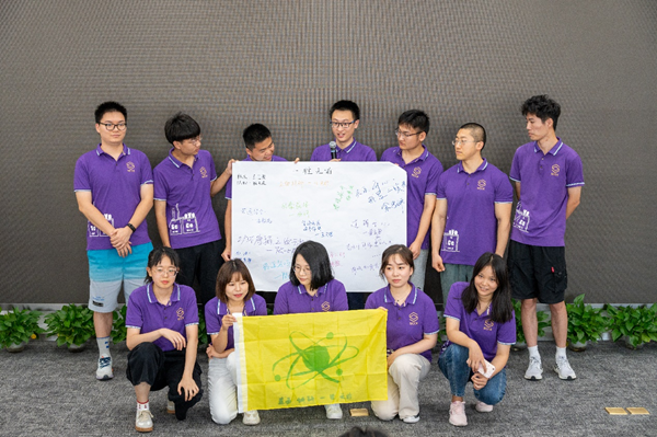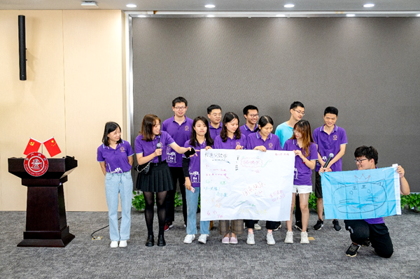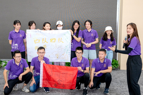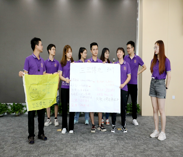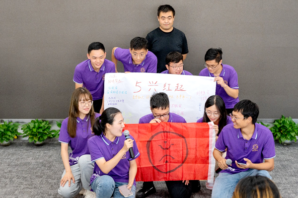 在接下来的团队组建活动中,同学们随机组成了五支队伍,并在队长带领下展开了热烈的讨论。每支队伍在确定了各自的队名、口号、吉祥物、队歌和队旗后,向大家展示其中含义,每位成员也分别进行了自我介绍。本次体验式培训形成的队伍分别是“一往无前队”、“猫猫队”、“三三得九队”、“四两拨千金队”和“五兴红起队”。