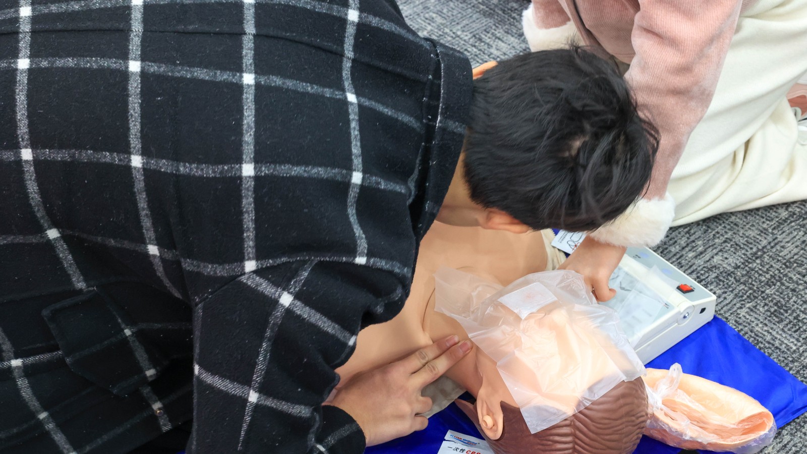 在现场准备了30套仿真人模、AED除颤仪等道具,各位师生在刘院长、黄医生、林医生的演示和指导下,认真学习了救援手法与规则,同时在仿真人模上演练了胸外按压、AED除颤等心肺复苏救护方法。