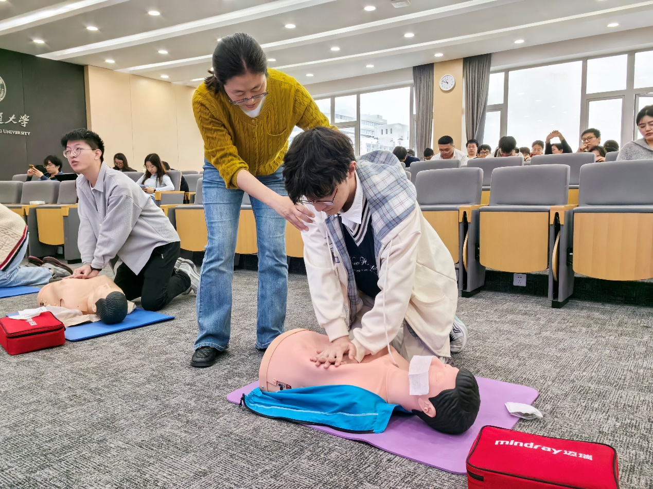 在理论讲解的基础上,四位急救师还带领同学们开展了实操训练。通过模拟成人心肺复苏和AED使用的场景,让每位同学都有机会上手操作,亲身体验急救技能的实际应用。同学们在急救师的指导下,认真练习,不断纠正自身动作。通过实操训练,同学们不仅掌握了急救技能,还提高了自己的应急反应能力。