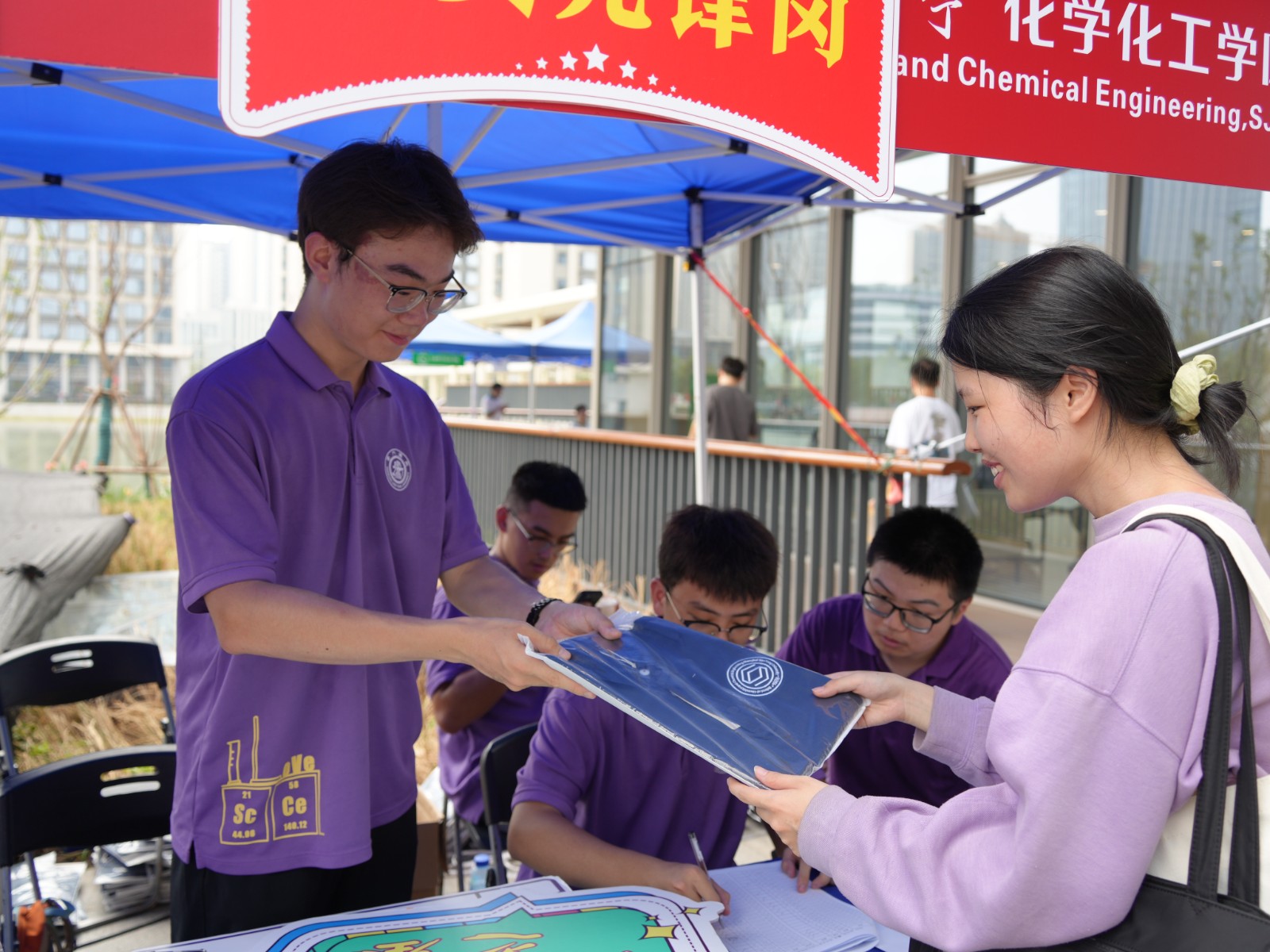 吴映强和姜学松共同为新生代表送上校徽与学院纪念礼物。校徽象征着交大的精神传承,学院纪念礼物承载着对新生的殷切期许。