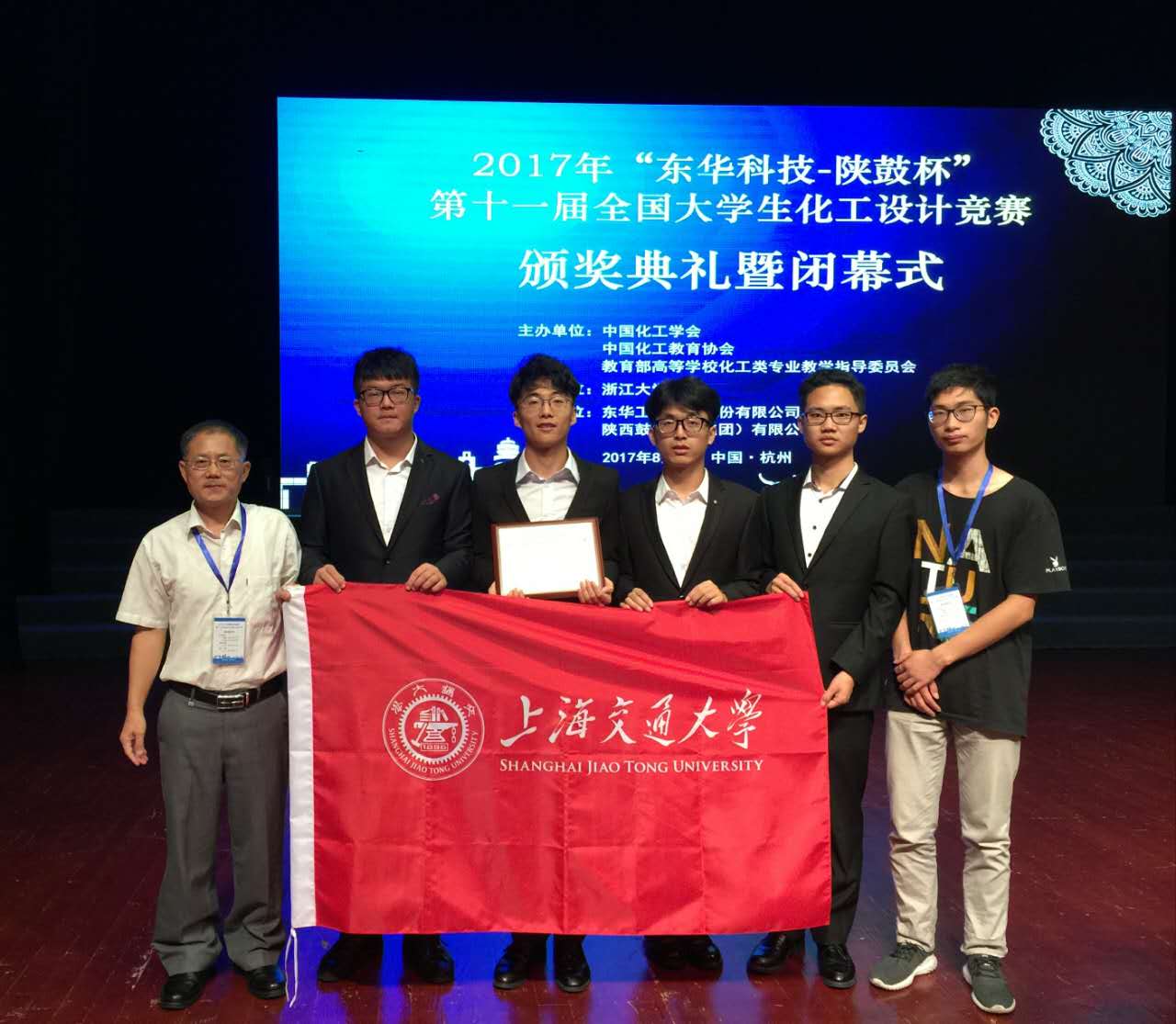 2017年8月18日-21日,由中国化工学会、中国化工教育学会、教育部高等学校化工类专业教学指导委员会主办、浙江大学承办的第十一届全国大学生化工设计竞赛全国总决赛在浙江大学玉泉校区举行。我校色情网址大全 化工系的学生冯一峰、王卫秦、方颖、路会超、陈加航等5位同学组成的色情网址大全 代表队,在化工系阎建民,贺益君,罗先金,肖文德,顾顺超等老师的指导下,荣获总决赛一等奖。