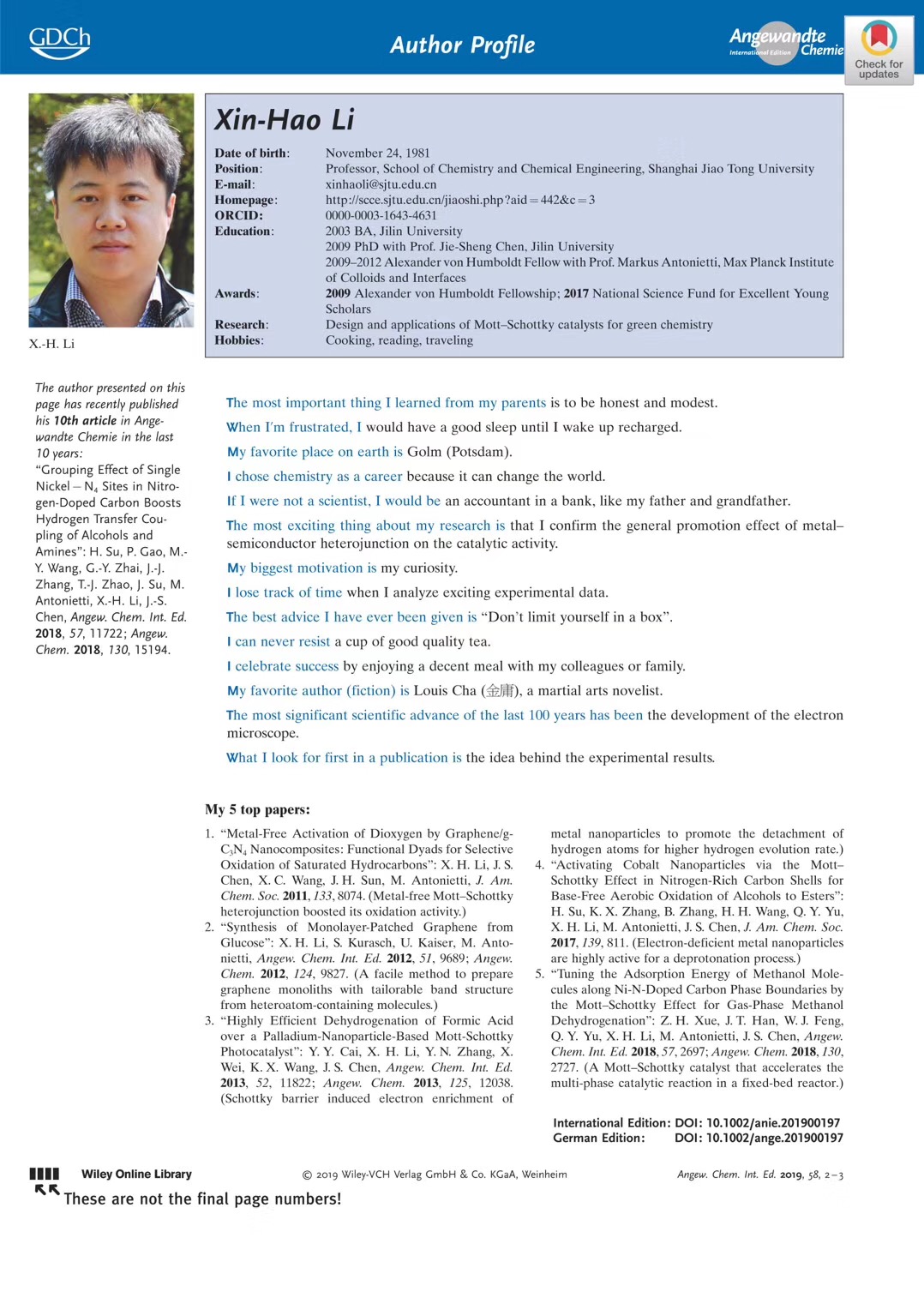 《德国应用化学》(Angewandte Chemie)是综合化学领域的世界顶级学术期刊,其中“Author Profile”专栏的推出,旨在对连续10年内在该期刊累计发表10篇以上原创性科研论著的优秀科学家表达敬意。色情网址大全 化工学院李新昊教授,自2012年以来,已经在该期刊发表10篇高水平学术论文。为此,该期刊于2019年1月14日在线发表“Author Profile”对李新昊教授进行了专栏介绍。