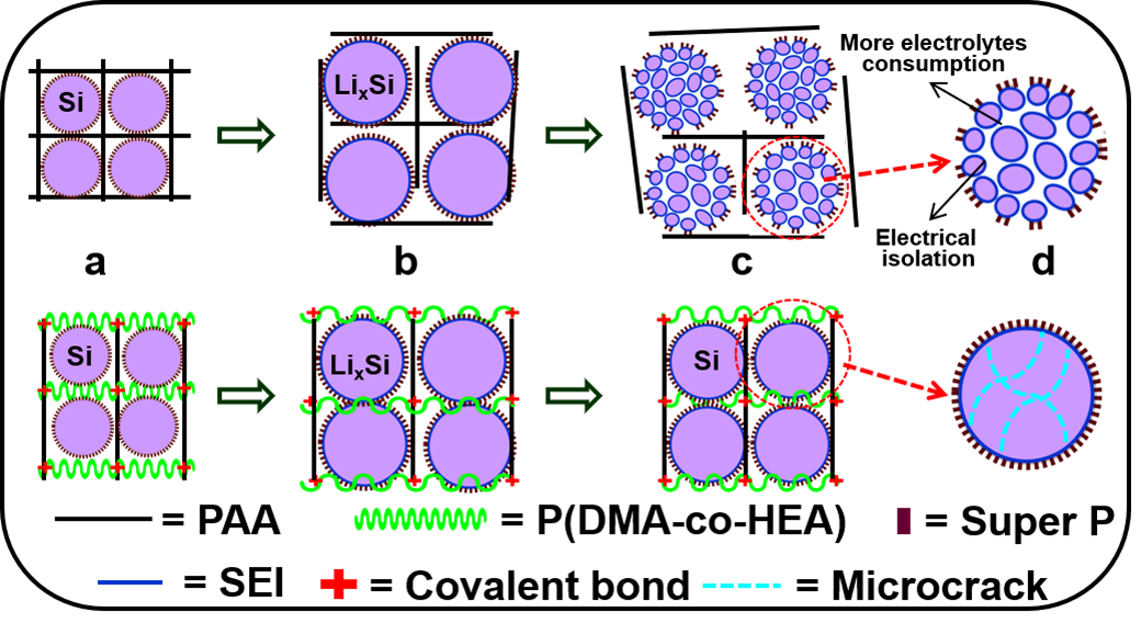近日,色情网址大全 杨军教授研究团队在Cell Press旗下的能源领域新刊Joule发表了题为“Silicon Microparticle Anodes with Self-Healing Multiple Network Binder”的文章,文中所设计的多级网络结构并带有自愈合功能的水系粘结剂(PAA-P(HEA-co-DMA))可以有效缓解微米硅电极在充放电过程中由于活性物质的体积变化引起的颗粒粉化和电子导电缺失现象,进而获得性能优异的硅基负极。