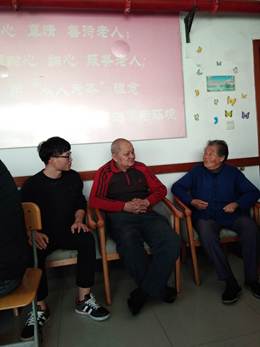 然后,同学们回到老人们所在的堂屋,坐到每一位老人的身旁,开始陪他们说说话。同学们非常亲切地问候了老人们最近的生活情况。渐渐地,整个堂屋里都回旋起了同学们和老人们交谈的声音,氤氲着一片祥和的气息。老人们像是打开了话匣子,颇有激情地给同学们讲起了自己年轻时候的事迹,或是娓娓道来内心深处最难以忘怀的往事,大家都默默聆听着。