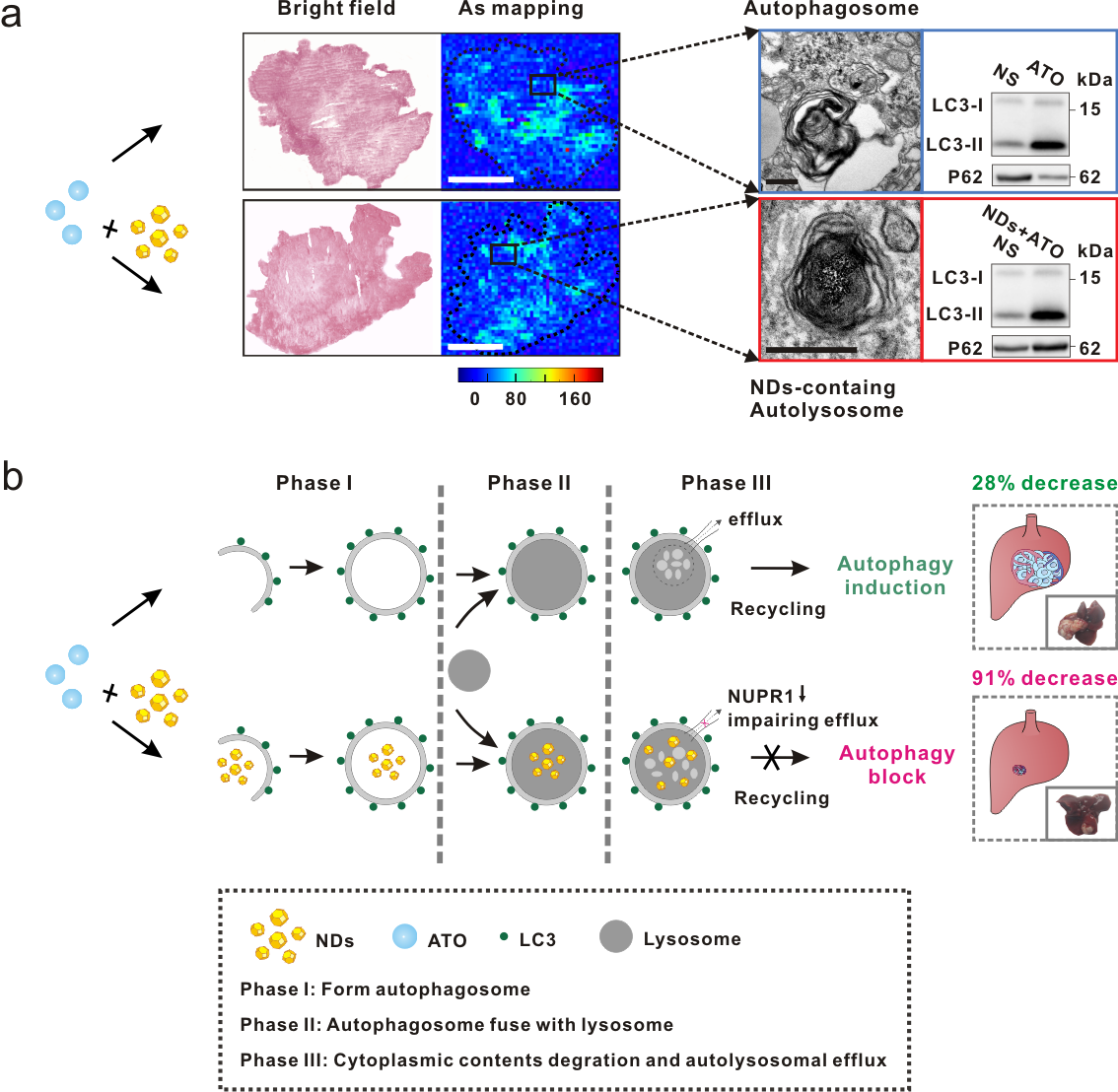 纳米金刚石提升三氧化二砷治疗肝脏肿瘤能力 a,b,实验(a)和示意图(b)显示三氧化二砷与纳米金刚石联用通过调节细胞自噬治疗实体瘤。a左:肿瘤组织中砷分布的X射线荧光显微成像图。a右:肿瘤组织电镜图(左)和肿瘤组织中自噬相关蛋白的表达(右)。 论文链接: Nanodiamond autophagy inhibitor allosterically improves the arsenical-based therapy of solid tumors.