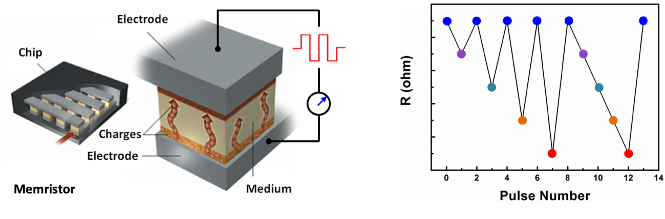 图2.(左)忆阻器结构、工作原理以及(右)电阻转变示意图。