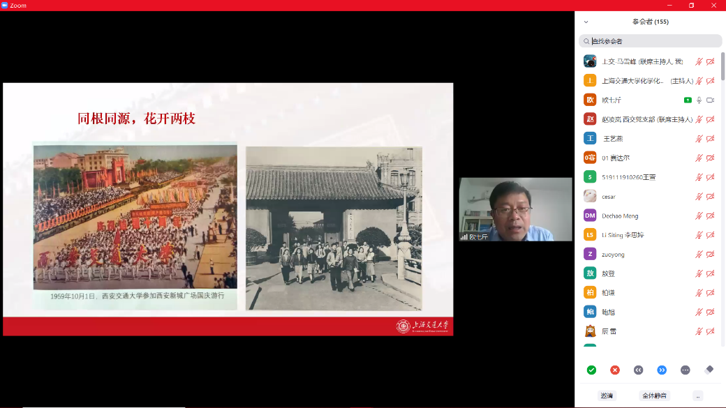 紧接着,欧七斤老师作“重温西迁往事、传承西迁精神”专题报告。欧七斤老师以详实的史料,为同学们讲解了“为何选择交通大学”、“从整体搬迁到两地办学”、“两所交大迈向一流”等历史过程。他指出,交大西迁是新中国高等教育史上一件大事,改变了西部高教格局,具有重要的时代意义,充分体现了交大人胸怀大局、无私奉献、弘扬传统、艰苦创业的精神。欧七斤老师表示在世界处于百年未有之大变局的今天,两校青年应当深入学习西迁历史,将个人发展与国家发展紧密结合起来,传承和实践西迁精神。